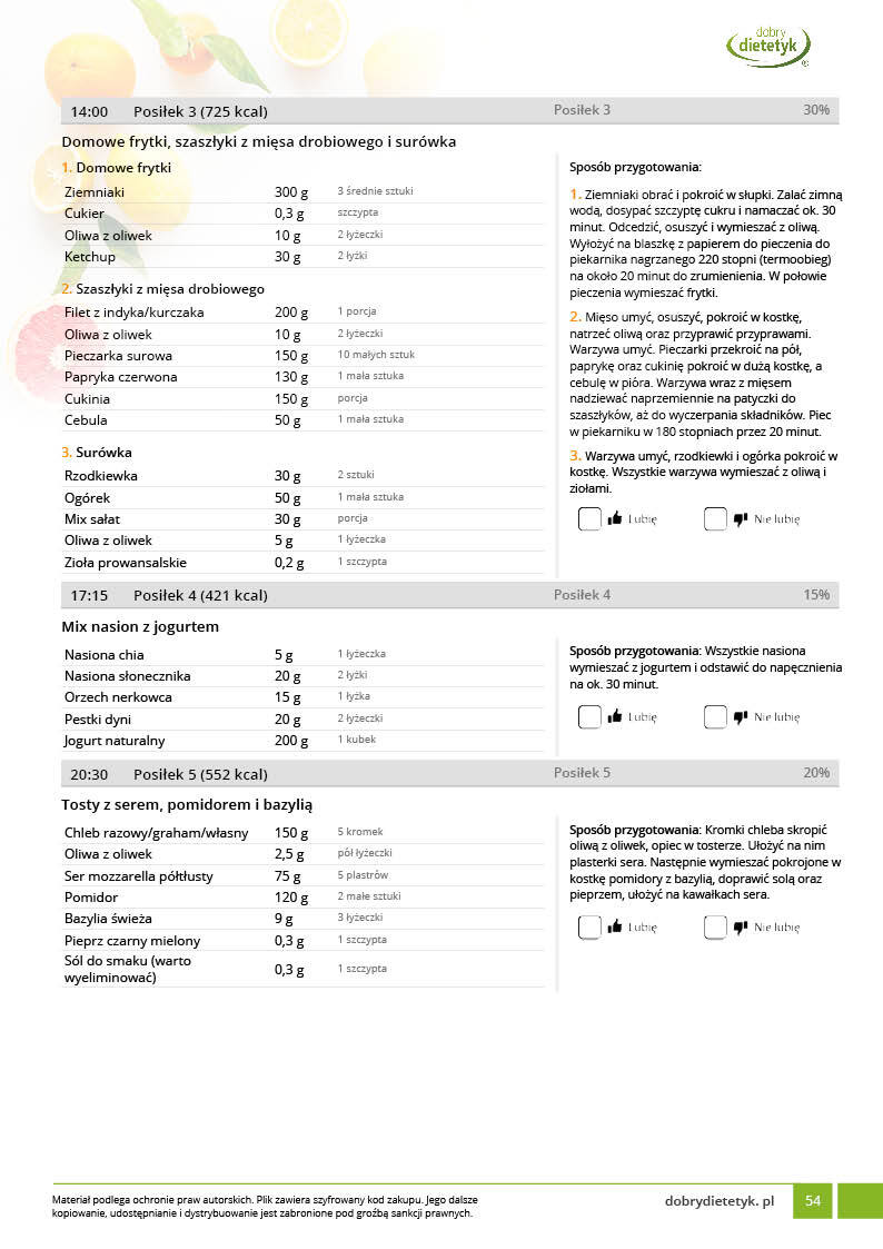 w formie propozycji posiłków (zamiast pojedynczych jadłospisów jednodniowych, przygotowano propozycje kilku propozycji dań na każdy posiłek). Tutaj nie uzależniamy Cię od tego jakie masz np. w danym dniu zjeść śniadanie czy obiad, tylko sam wybierasz sobie ulubione danie z kilku przedstawionych przez nas propozycji.